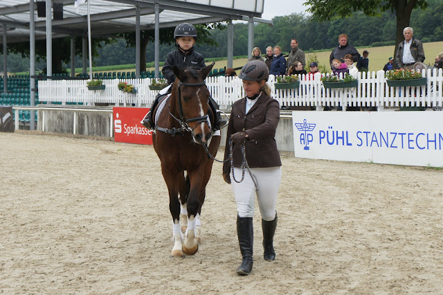 Taluttajana toimi eräs miehen valmennettava, ja ratsuna Veiwil-poni, jolla siis minä normaalisti ratsastan... :D Kyseessä oli "Führzügelklasse" jossa on siis taluttaja, ratsasastusta kyllä hiukan arvostellaan (eli istuntaa ja vaikutusta ratsuun, asianmukaisia varusteita sekä hymyä :D Miehen pomo sanoikin alkaneensa esteratsastajaksi vain siksi, että hymyilemättömyys ei vaikuta lopputulokseen) mutta kaikki saavat silti palkinnon.